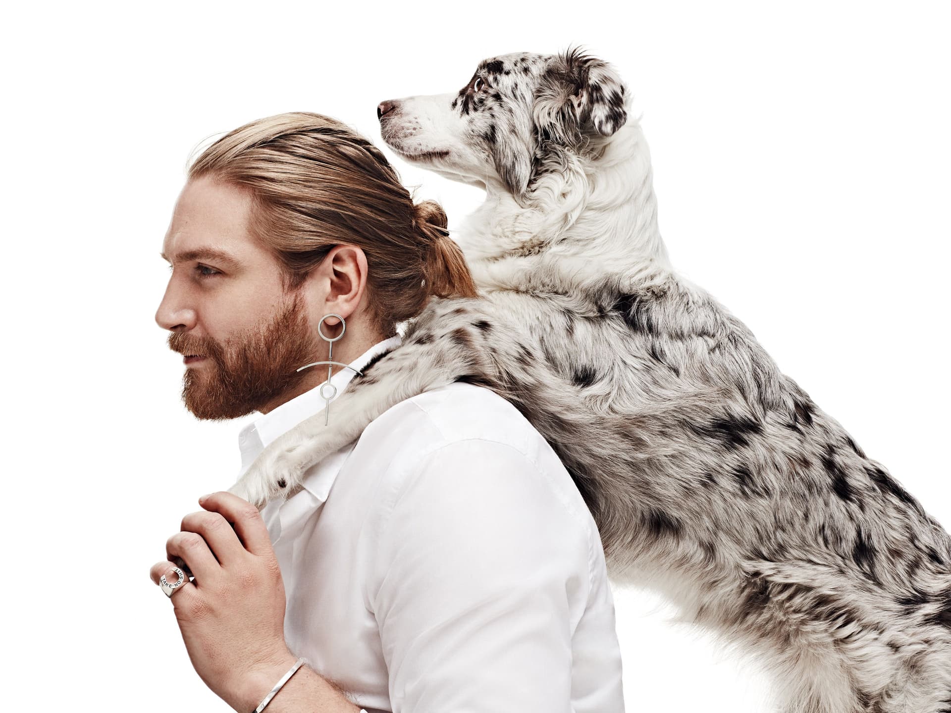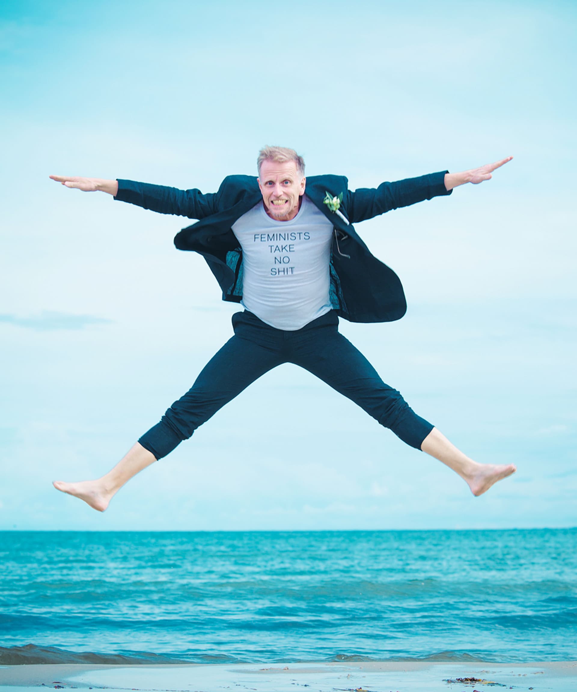 My wife and I chose to get engaged with rings designed by Efva Attling and my wife Eva wanted a wedding ring by Efva Attling as well. When we were in her shop in Gothenburg to look at wedding rings I saw her T-shirt with the message "Feminists take no shit ”. I instantly thought it was cool and that it would fit perfectly on mine and Eva's barefoot wedding on the beach at Österlen. I also wanted to wear the t-shirt to honour my then future wife, because to me she is a woman who does not take any crap from anyone. In other words, my wife is a female role model for me.