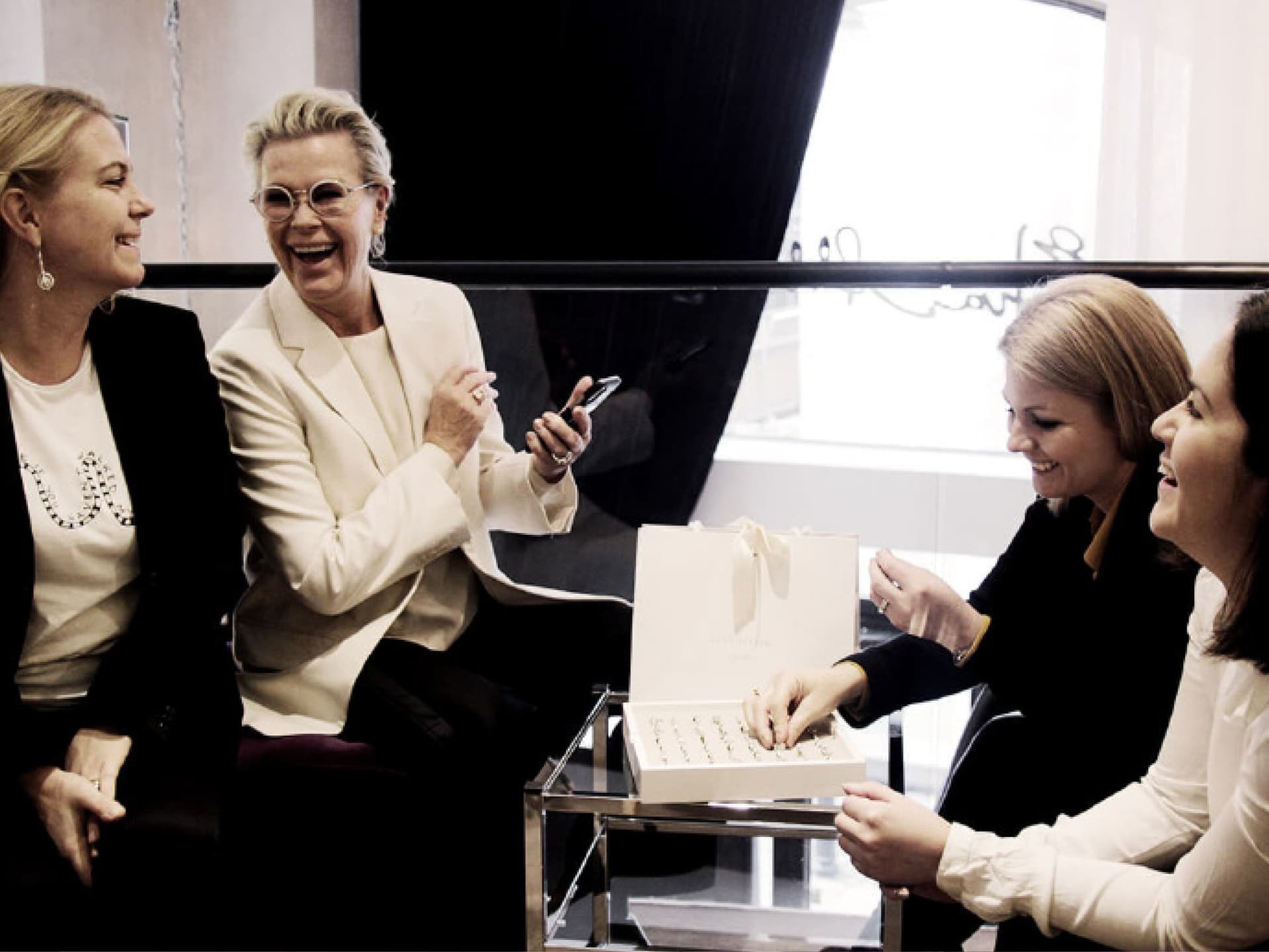 Efva kävelee ylös portaita myymälän yläkertaan. Hänen jälkeensä tulevat Helena, Soledad ja Jenny, jotka kaikki ovat päivittäin yhteydessä asiakkaisiin – sekä myymälöissä että verkkokaupan asiakaspalvelun kautta. He ovat vuosien aikana vastanneet enemmän tai vähemmän kaikkiin hää- ja kihlakoruihin liittyviin kysymyksiin. He yrittävät yhdessä vastata joihinkin yleisimpiin kysymyksiin. Istumme purppuran värisillä samettisohvilla. Tämä on paikka, jossa innostuneet parit kokeilevat viikoittain kihla- ja vihkisormuksia valkoisesta häärasiasta, joka on täytetty Efvan designilla.