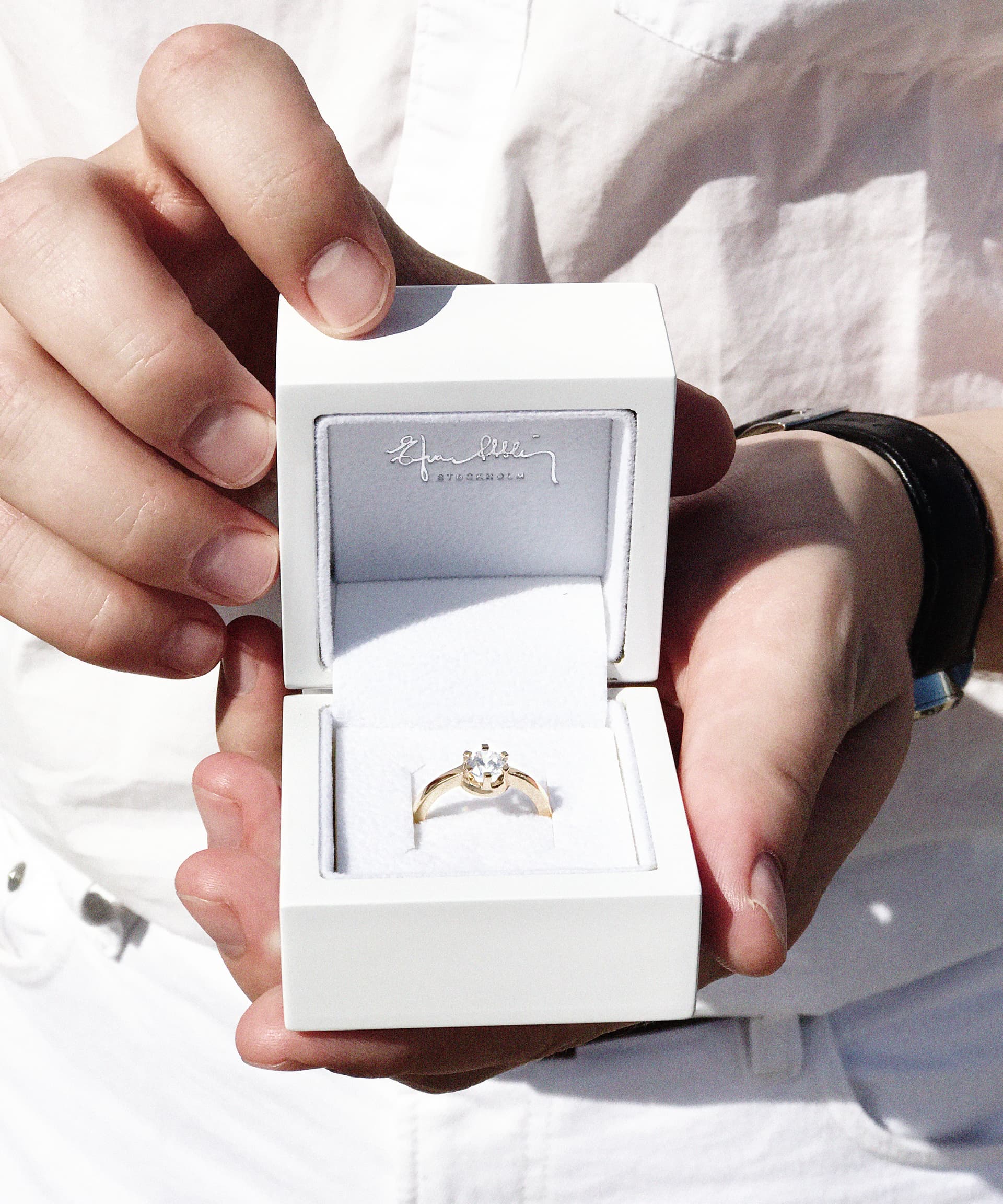 “On myös mahdollista vuokrata kihlasormus kosintaan”, Jenny sanoo. “Meillä on palvelu, jota kutsumme nimellä ”Say Yes”. Voit vuokrata mallisormuksen 14 päiväksi. Voit käyttää mallia, kun kysyt suuren kysymyksen. Sen jälkeen voitte yhdessä valita oikean sormuksen. Kihlasormuksemme toimitusaika on pari viikkoa, koska sormukset tehdään tilauksesta käsin. Mutta kun vuokraat sormuksen, saat sen 1–3 arkipäivän sisällä, jos teet tilauksen verkossa, tai samana päivänä, jos vierailet missä tahansa myymälöistämme. Tällä tavalla sinun ei tarvitse tehdä suuria investointeja heti.