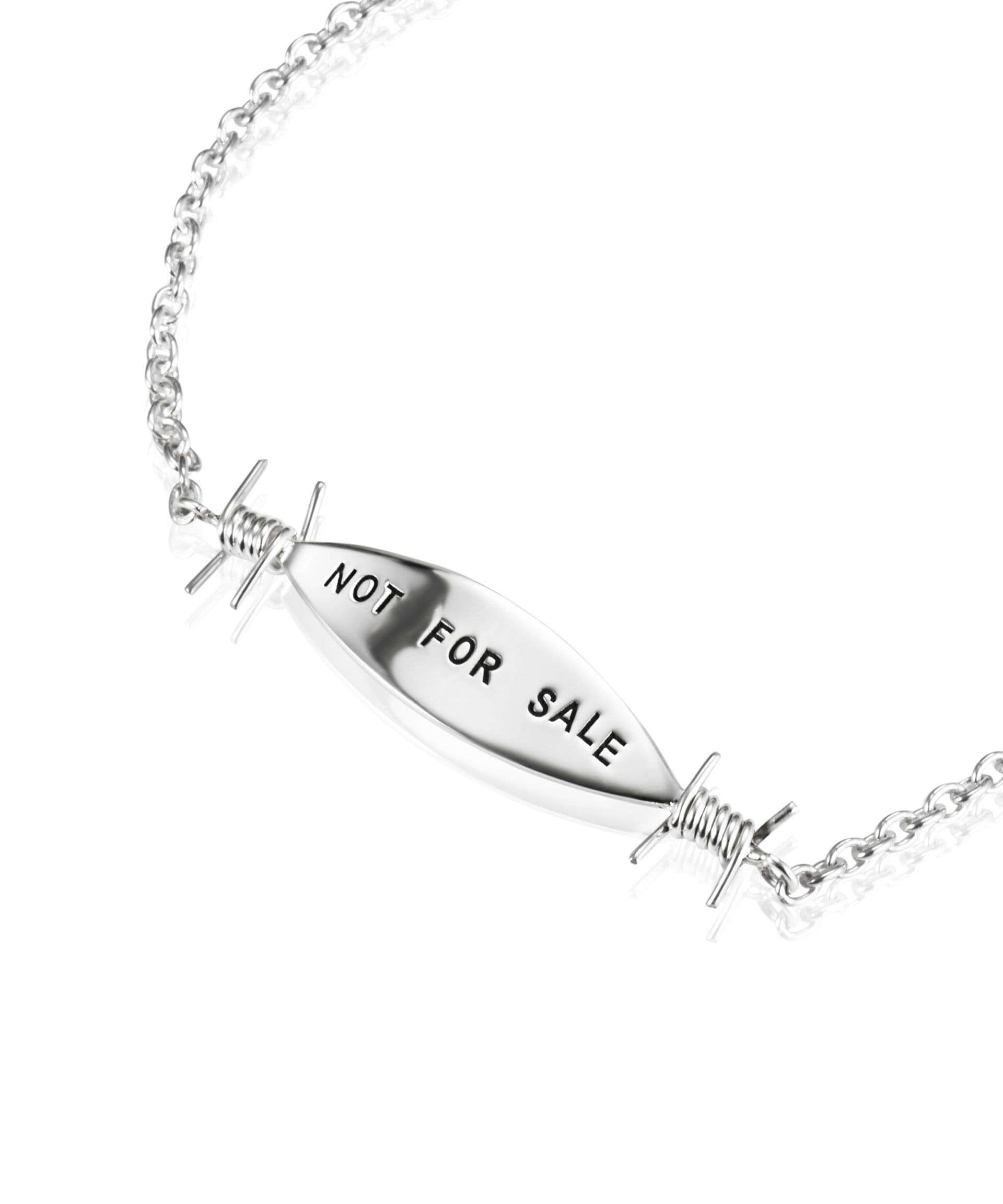 The collection consists of a necklace and a bracelet in silver, with the stamped text “NOT FOR SALE” with a barbed wire around. “When my design process begins, all my ideas and what I want to express with my pieces start to spin in my head,” says Efva. “This is about vulnerable girls, it’s serious and important. ‘Not for sale’ means that no child is for sale and the barbed wire around the words is to clarify ‘stay away’.”