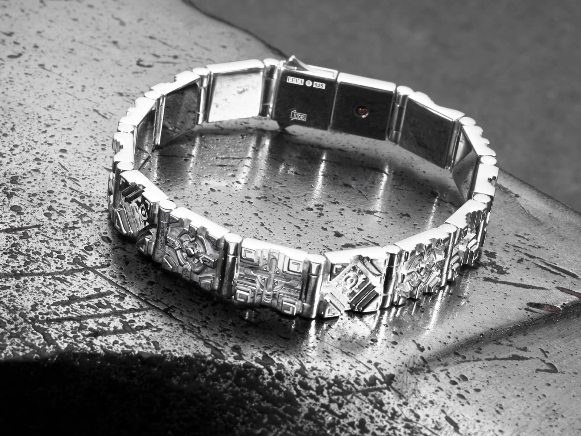 The collection also holds pieces with more contemporary flirts. Arc Bracelet is a piece with complex patterned silver plates inspired by one of the architect Frank Lloyd Wright’s most known buildings in Los Angeles. A building close to the studio where Kent’s second last album, “Tigerdrottningen”, was recorded. And also Hell Key, the same symbol as Jocke has tattooed on one of his forearms.