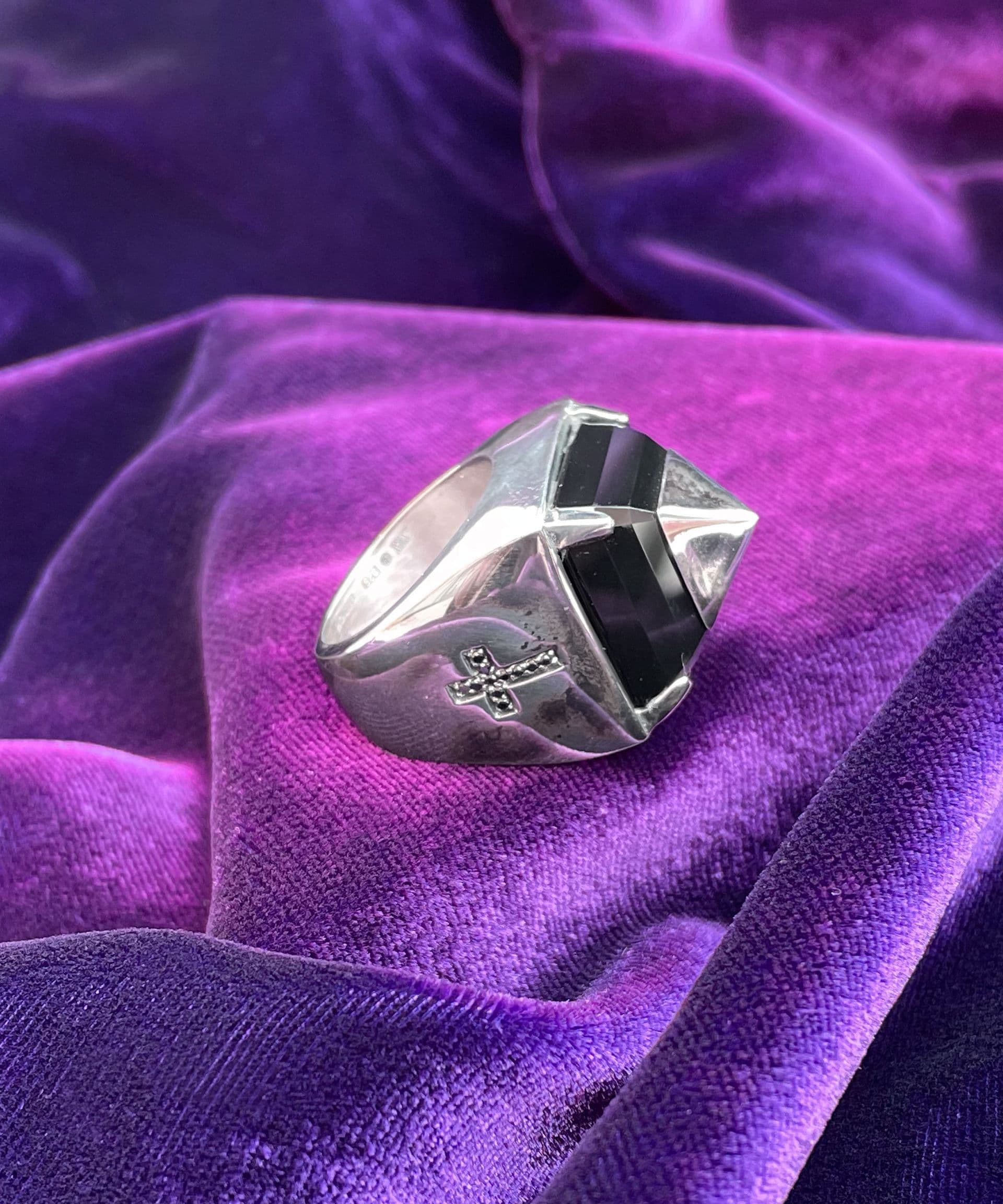 Small crosses are also embossed with black diamonds in the ring, which is perhaps the most exclusive piece in the collection. Jonas wanted to make a really solid ring in the shape of a pyramid rivet, in black onyx. But that made Efva, with her craftsmanship, interfere; “It would have been too fragile, so I put a small silver rivet on top of the onyx, both as a protection and because it looks nice. I don’t want to get a lot of rings in return after wild heavy metal parties.”